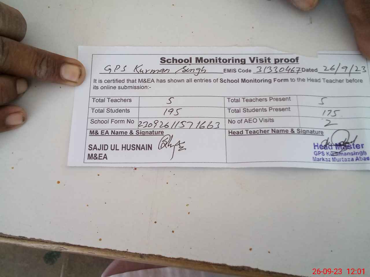 | Attendance Register | Head Teacher | MEA with School | Visit Proof |
