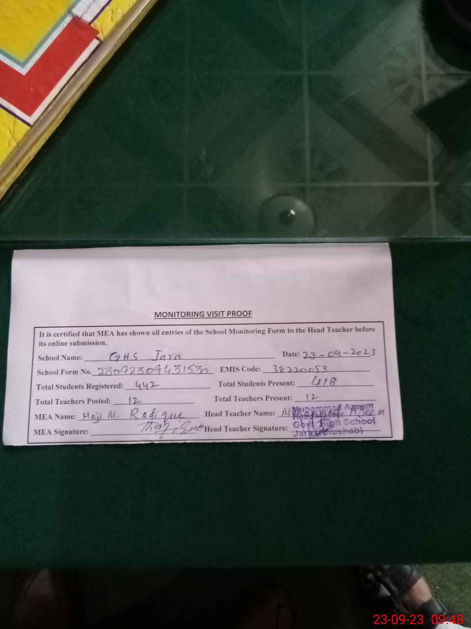 | Attendance Register | Head Teacher | MEA with School | Visit Proof |