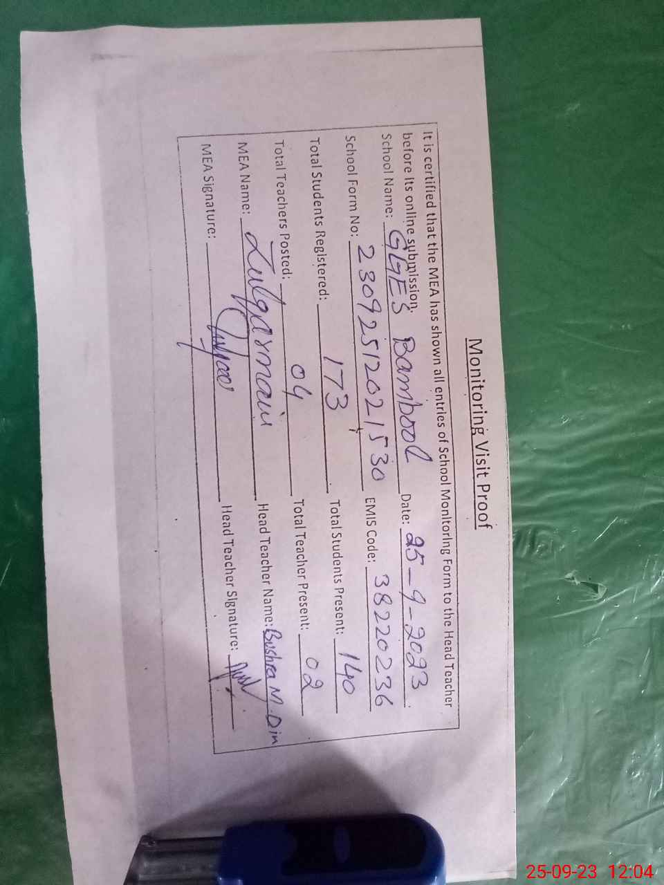 | Attendance Register | Head Teacher | MEA with School | Visit Proof |