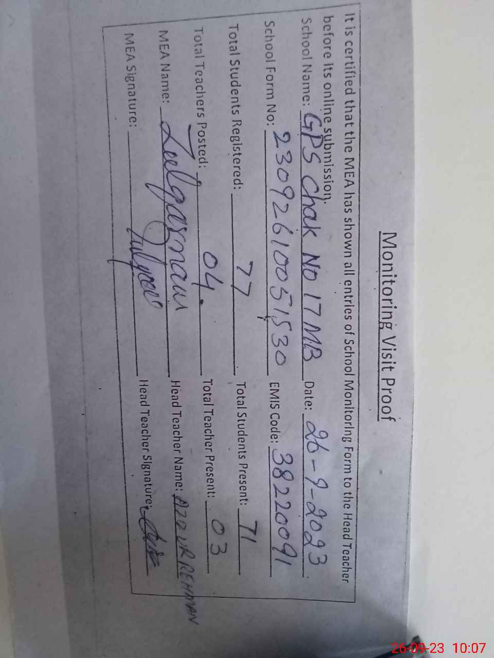 | EMIS Code: 38220091 | Name of School: GPS CHAK NO. 17/MB | |||