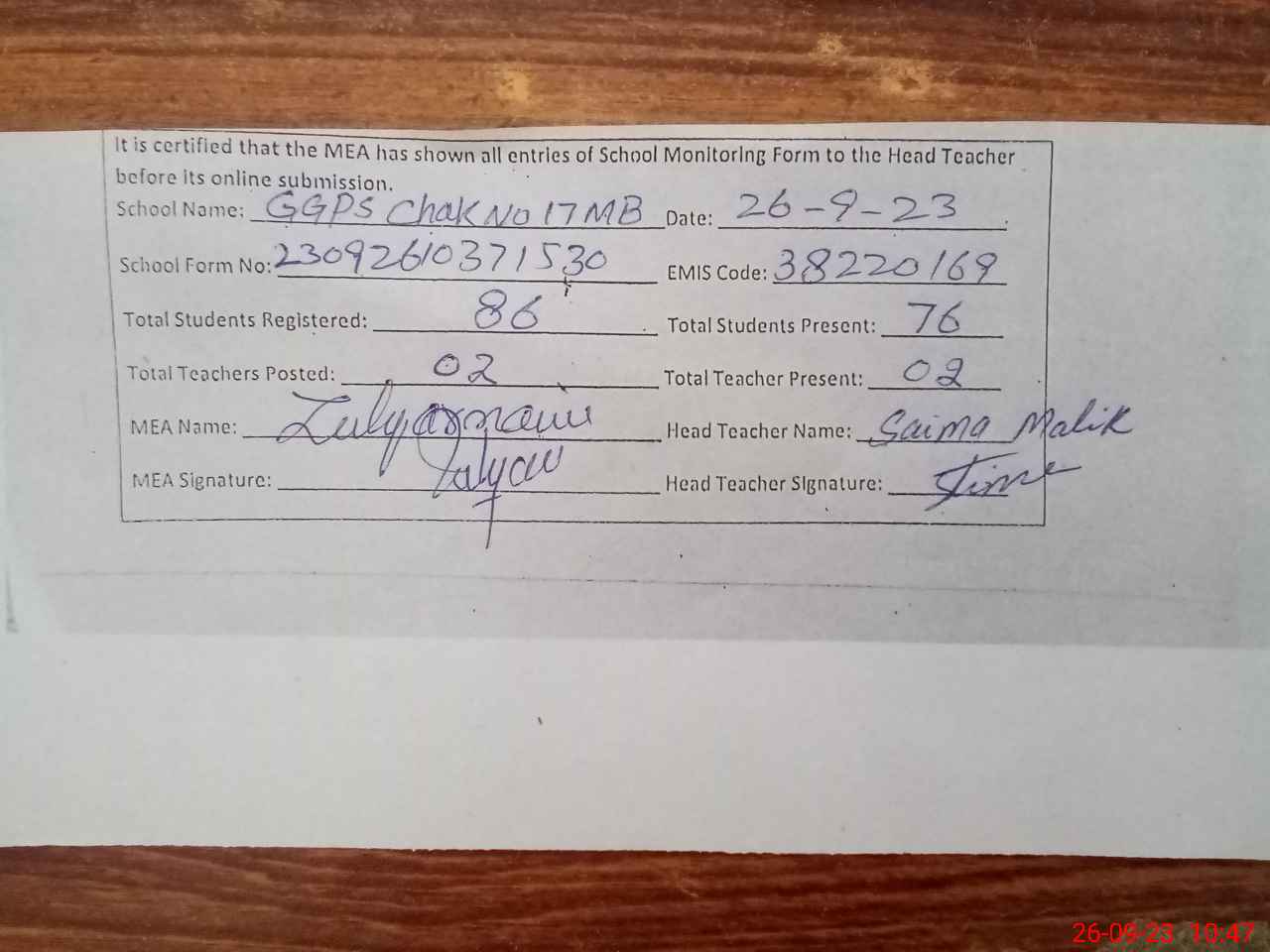| Certified that this School was Inspected by the Undersigned MEA/DMO Today and the Information Stated Above is as Per Record. | |||||
