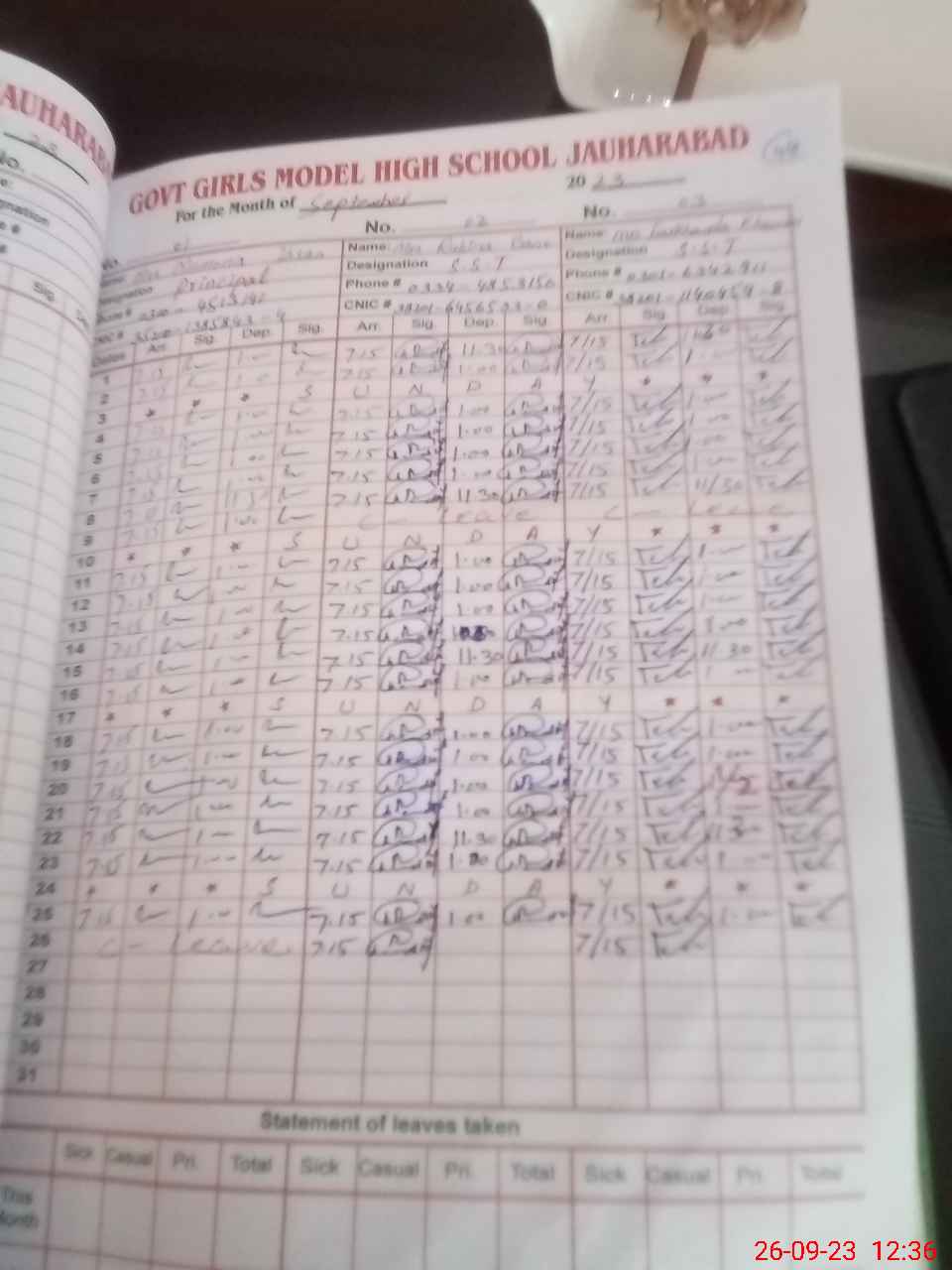 | CNIC | Full Name | Designation | R/C | Absence during last cal. month |