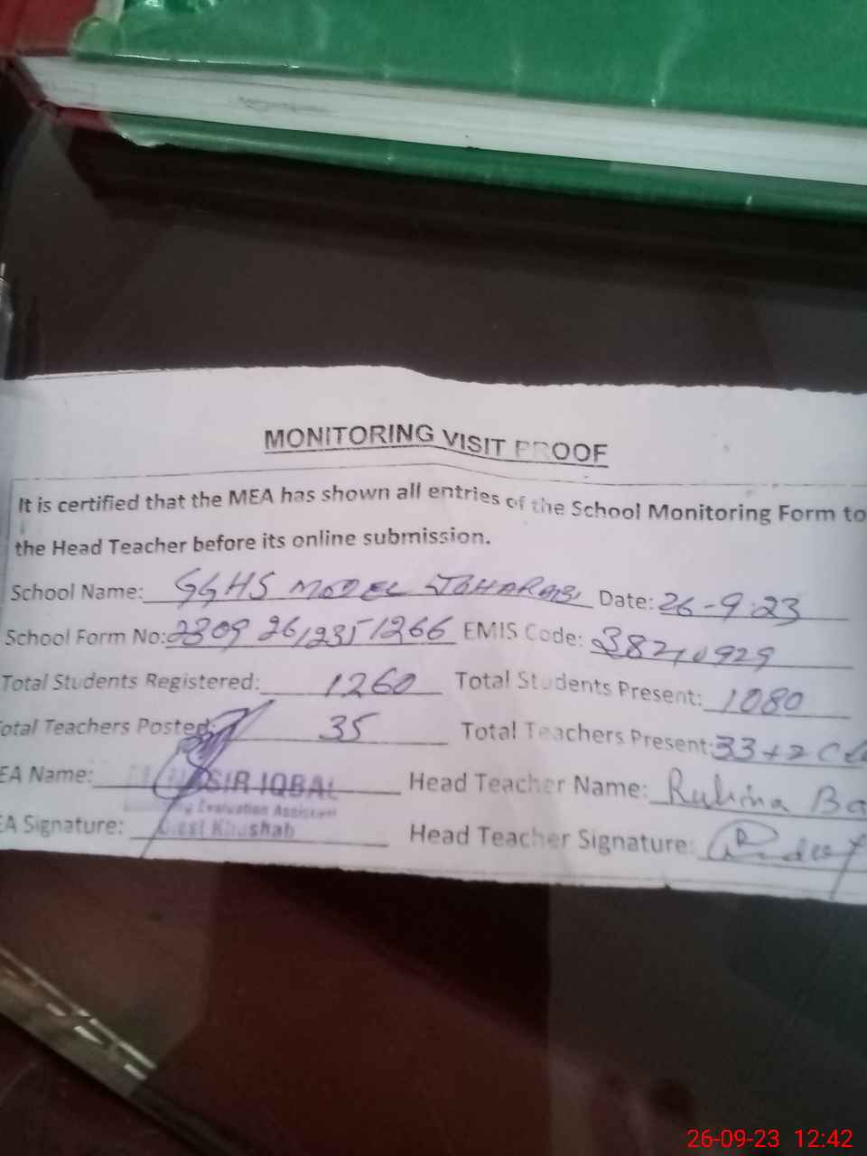 | Attendance Register | Head Teacher | MEA with School | Visit Proof |