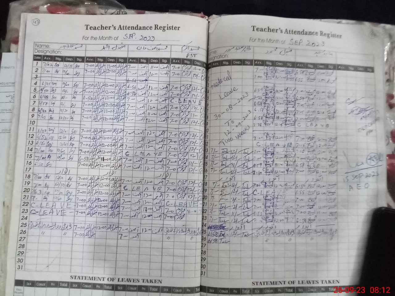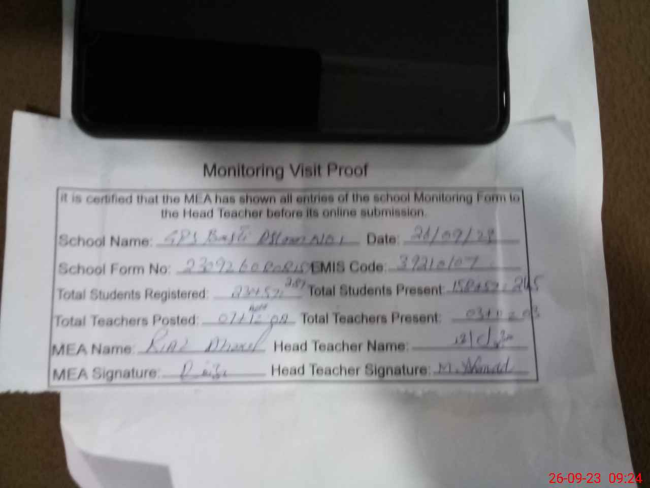 | Remarks (Use Separate Page if Required): PST Nadia Jabbar on Leave today she is on additional duty from 12SP from 18 Sep 2023 ECE teacher and care giver not present in class Separate class of ECE not arranged due short space No boundary wall separately of this as all School area covered only front area small wall available | |||||