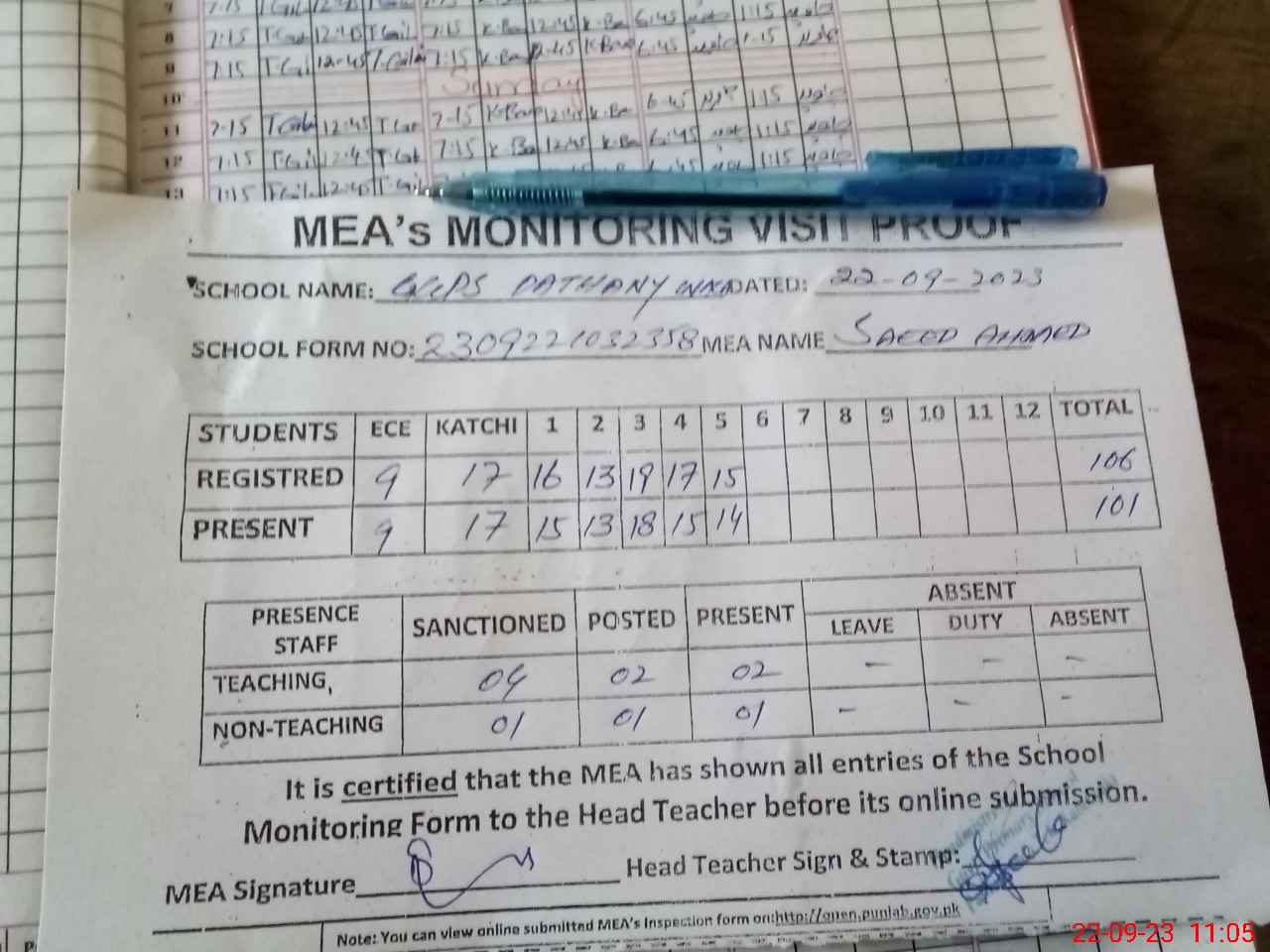 | Attendance Register | Head Teacher | MEA with School | Visit Proof |