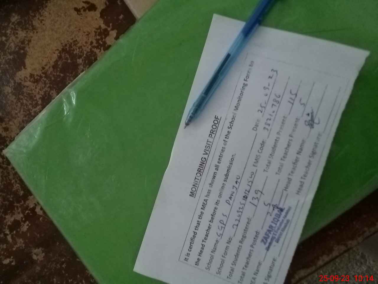 | Attendance Register | Head Teacher | MEA with School | Visit Proof |