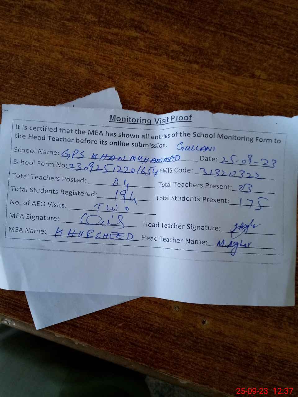 | Attendance Register | Head Teacher | MEA with School | Visit Proof |