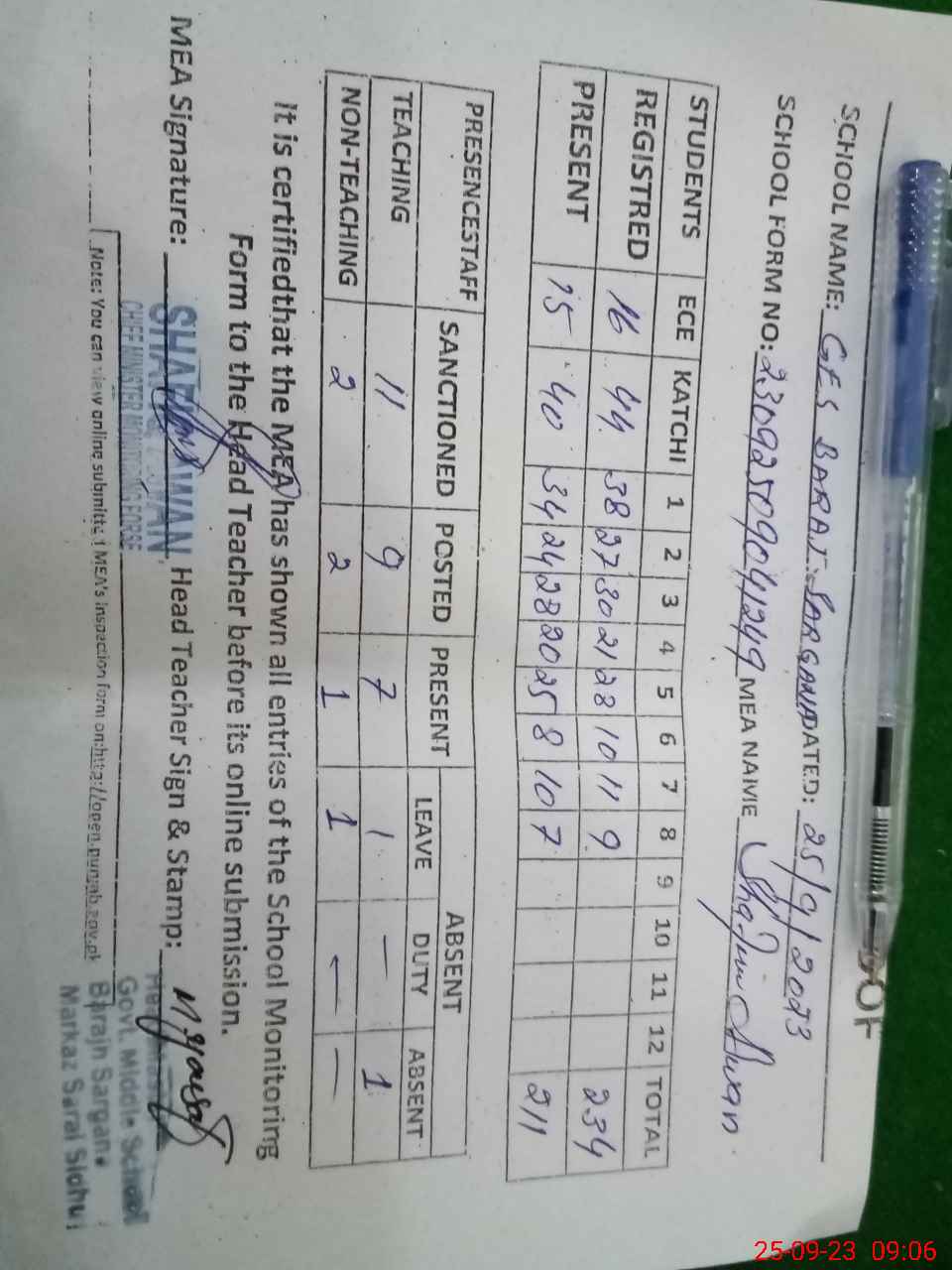 | Certified that this School was Inspected by the Undersigned MEA/DMO Today and the Information Stated Above is as Per Record. | |||||