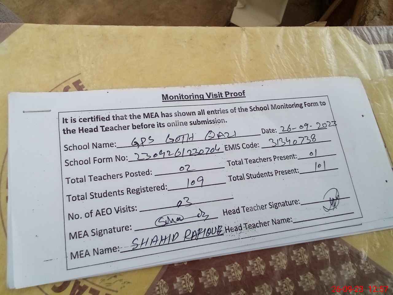 | Attendance Register | Head Teacher | MEA with School | Visit Proof |