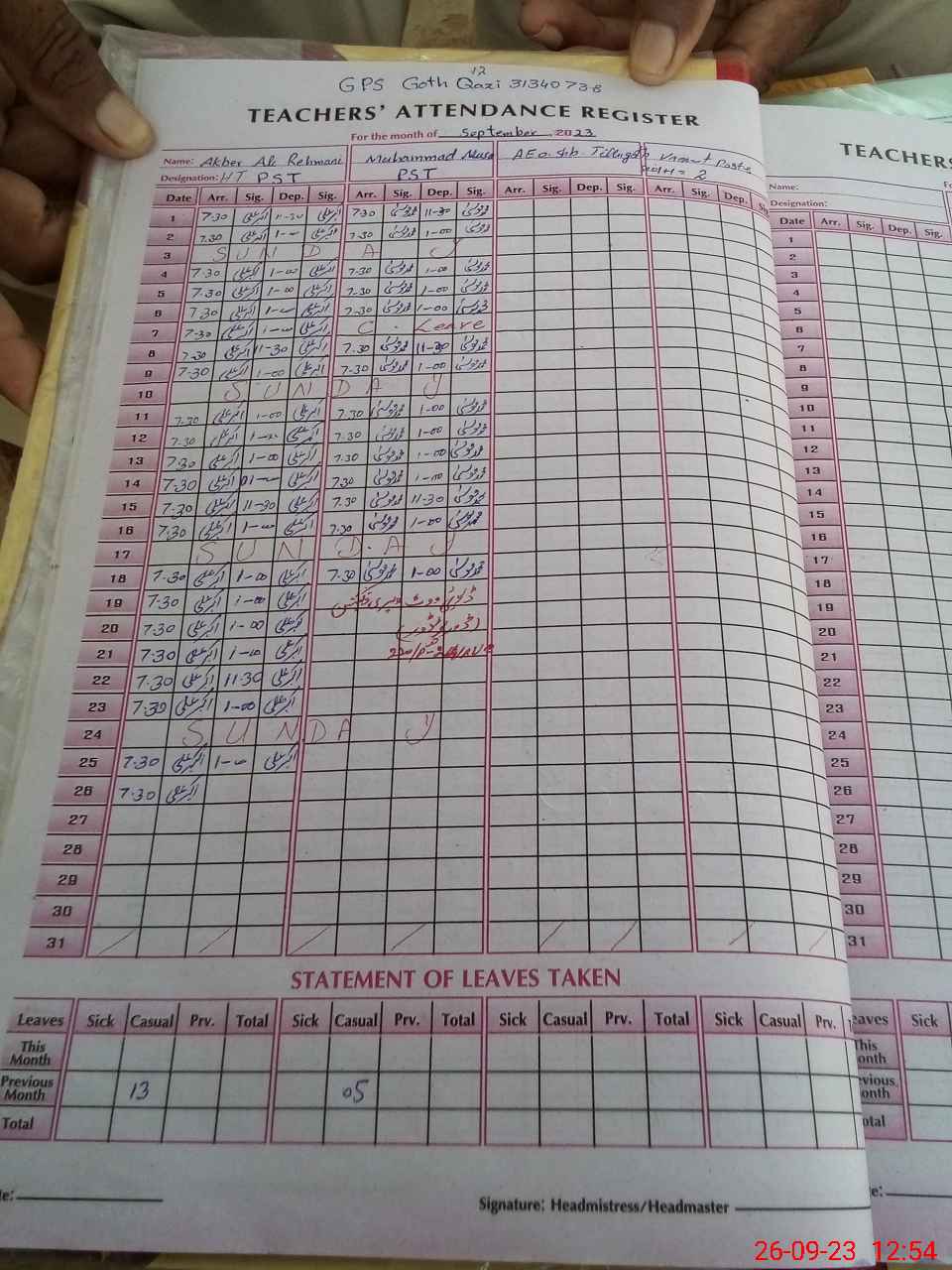 | Name: Mu**** Mu**** Designation: (School Headmaster's/Headmistress's) PST Phone/Cell Number: 03**** |