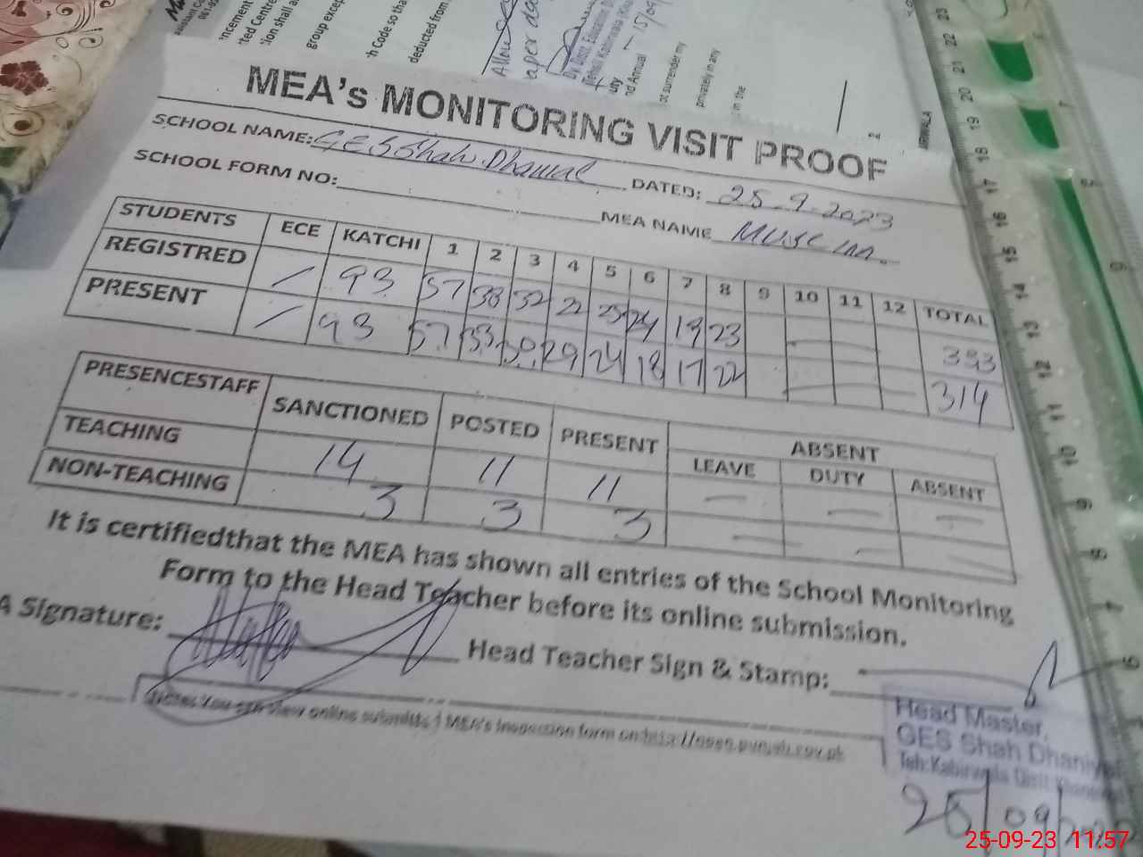 | Attendance Register | Head Teacher | MEA with School | Visit Proof |