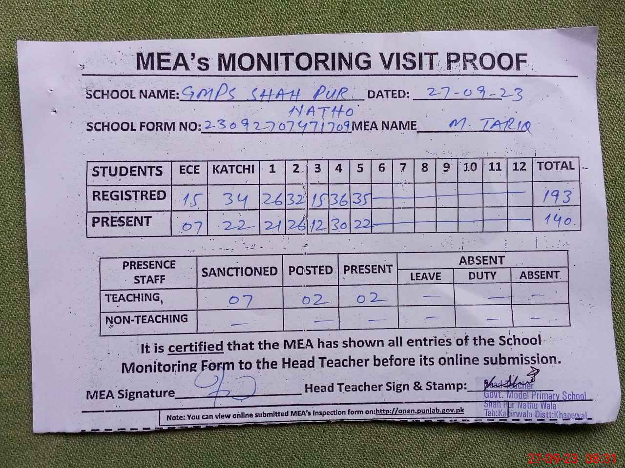| Attendance Register | Head Teacher | MEA with School | Visit Proof |