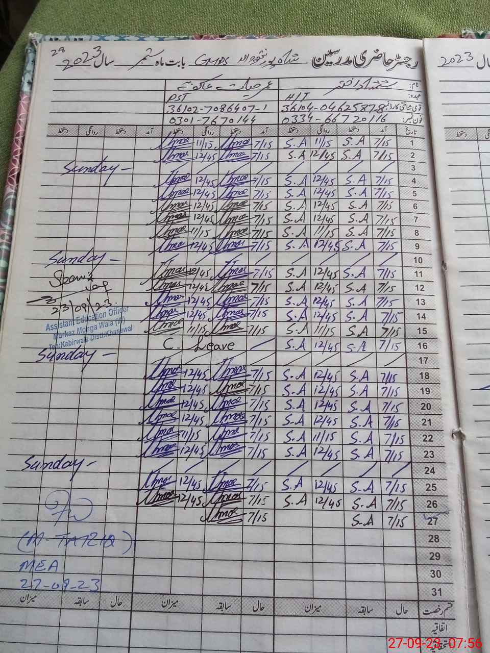 | Name: Sh**** Ak**** Designation: (School Headmaster's/Headmistress's) PST Phone/Cell Number: 03**** |