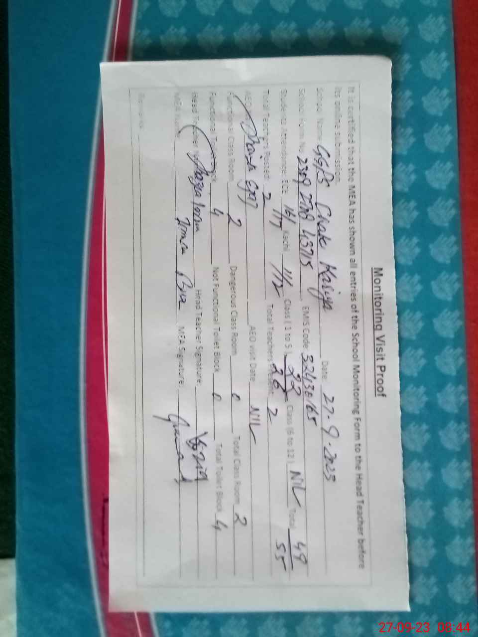 | Attendance Register | Head Teacher | MEA with School | Visit Proof |