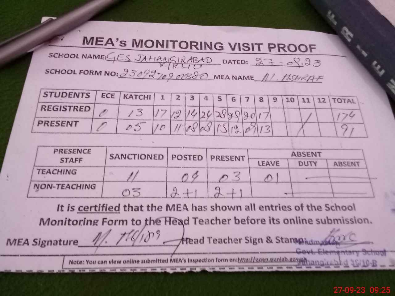 | Attendance Register | Head Teacher | MEA with School | Visit Proof |