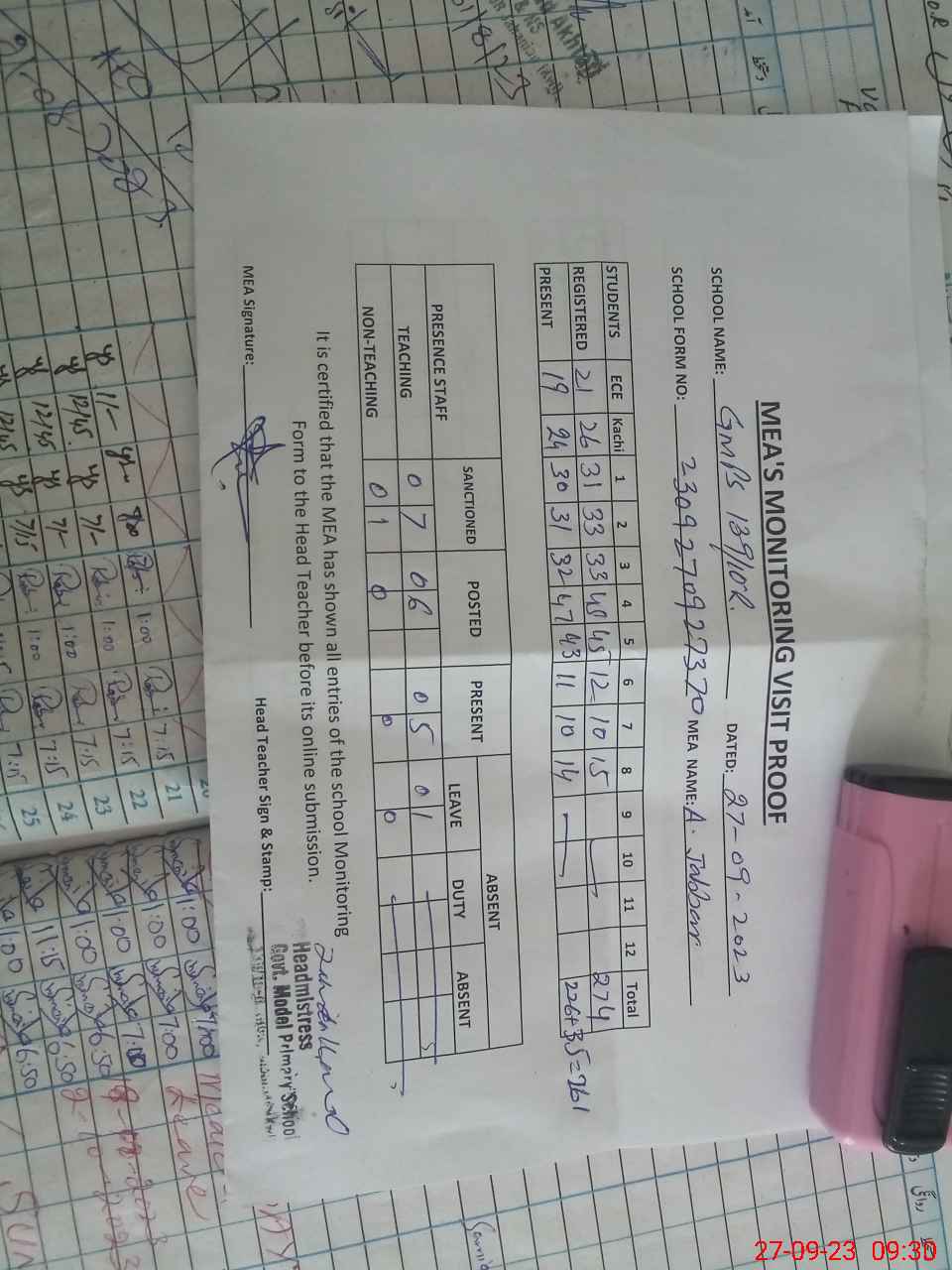 | Attendance Register | Head Teacher | MEA with School | Visit Proof |