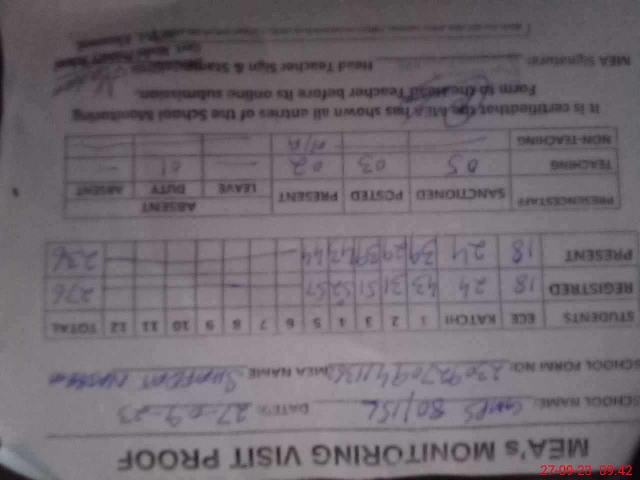 | Monitoring Date: 27-09-2023 | Start Time: 27-09-2023 08:23 AM | End Time: 27-09-2023 09:45 AM | Name of MEA: Sh**** Na**** | |