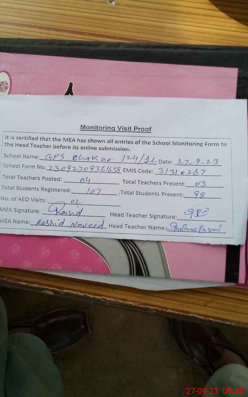| EMIS Code: 31310267 | Name of School: GPS CHAK NO. 124/1-L | |||