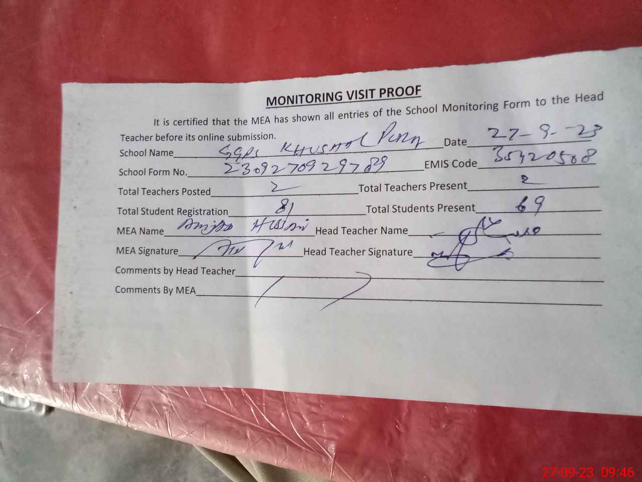 | Attendance Register | Head Teacher | MEA with School | Visit Proof |