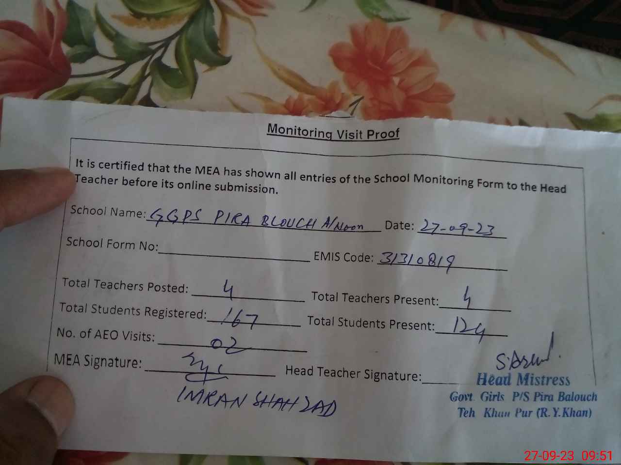 | Attendance Register | Head Teacher | MEA with School | Visit Proof |
