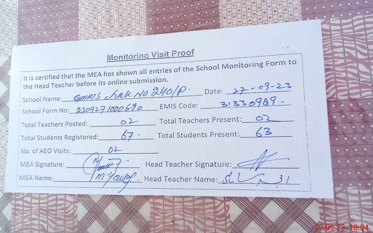 | EMIS Code: 31330989 | Name of School: GPS CHAK NO. 240/P | |||