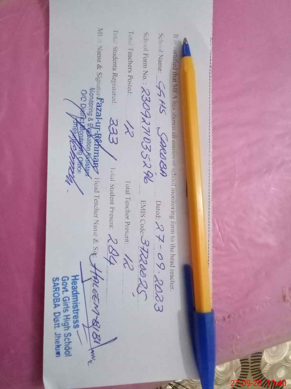 | Name: Za**** Pa**** Designation: (School Headmaster's/Headmistress's) H, MIS IT TEACHER Phone/Cell Number: 03**** |