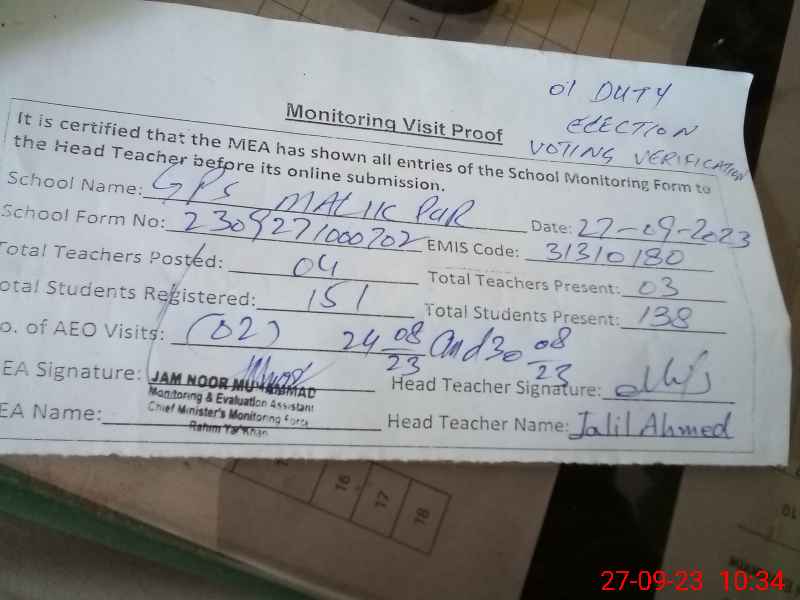 | EMIS Code: 31310180 | Name of School: GPS MALIK PUR (After Noon) | |||