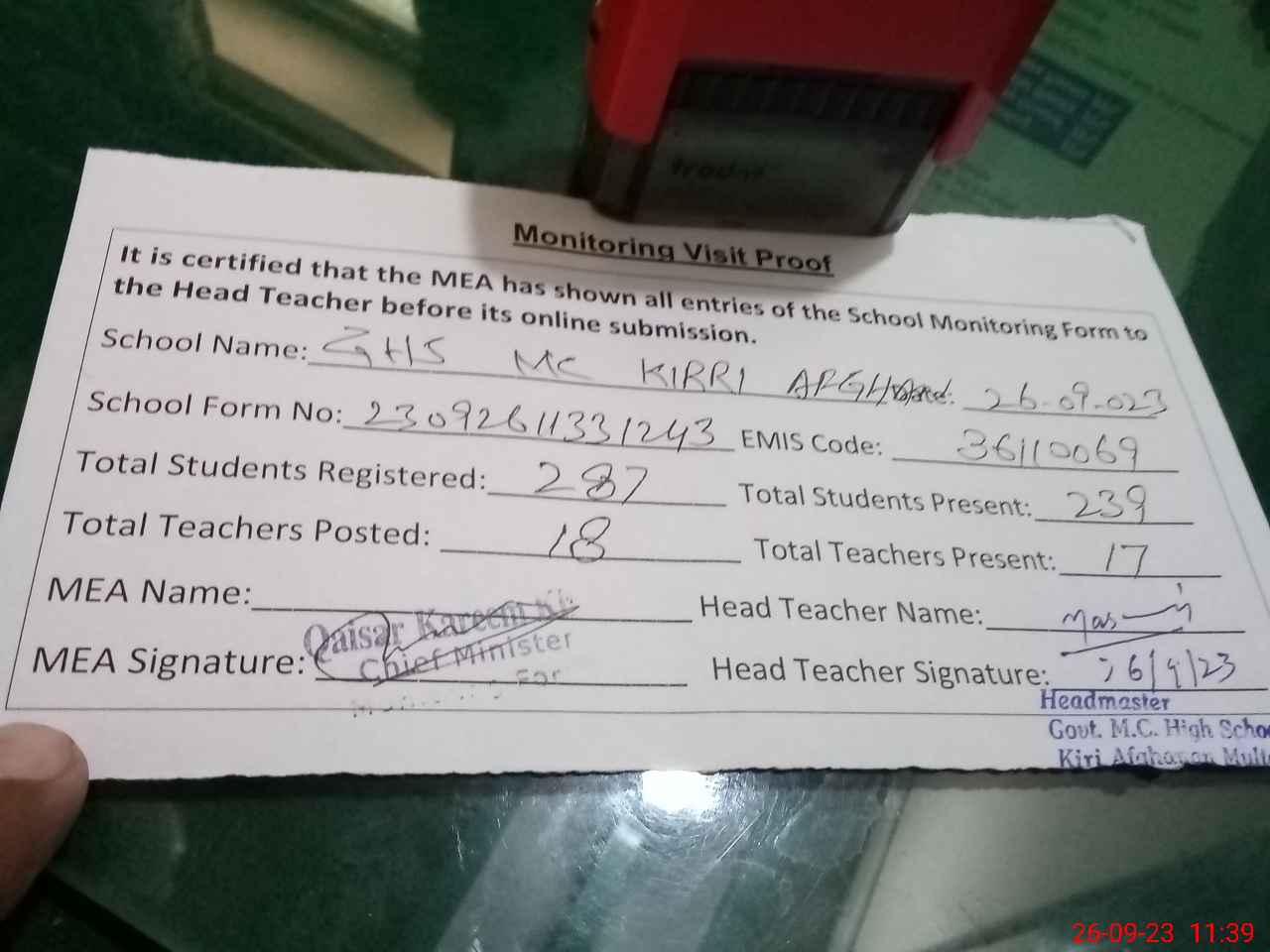 | Attendance Register | Head Teacher | MEA with School | Visit Proof |
