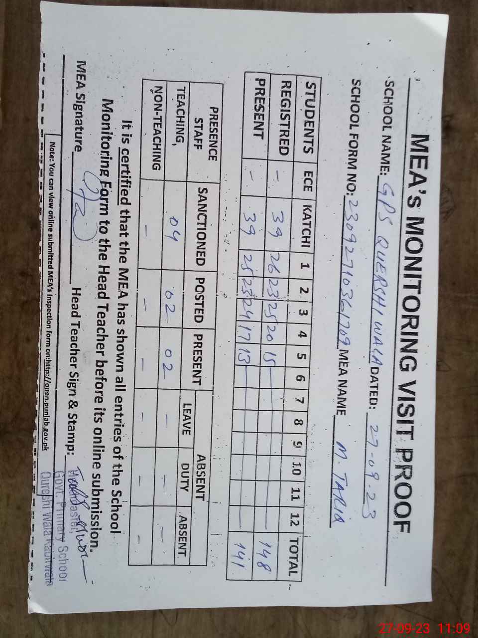 | Attendance Register | Head Teacher | MEA with School | Visit Proof |
