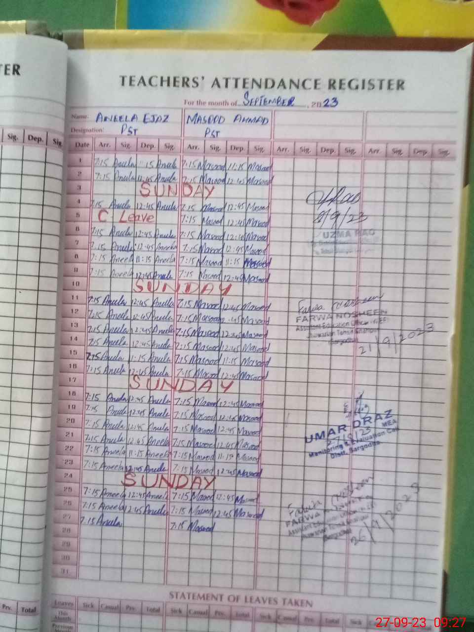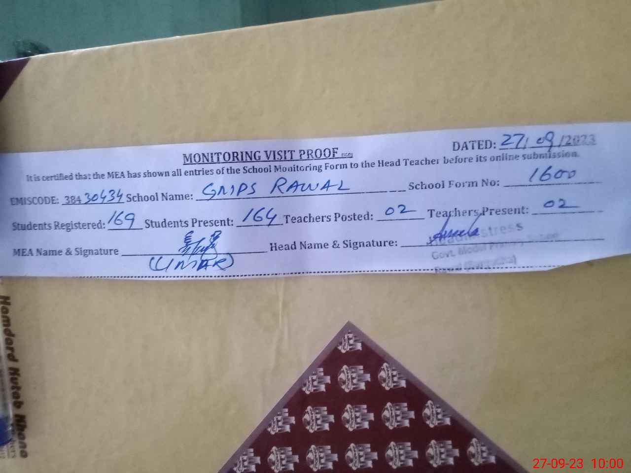 | Attendance Register | Head Teacher | MEA with School | Visit Proof |
