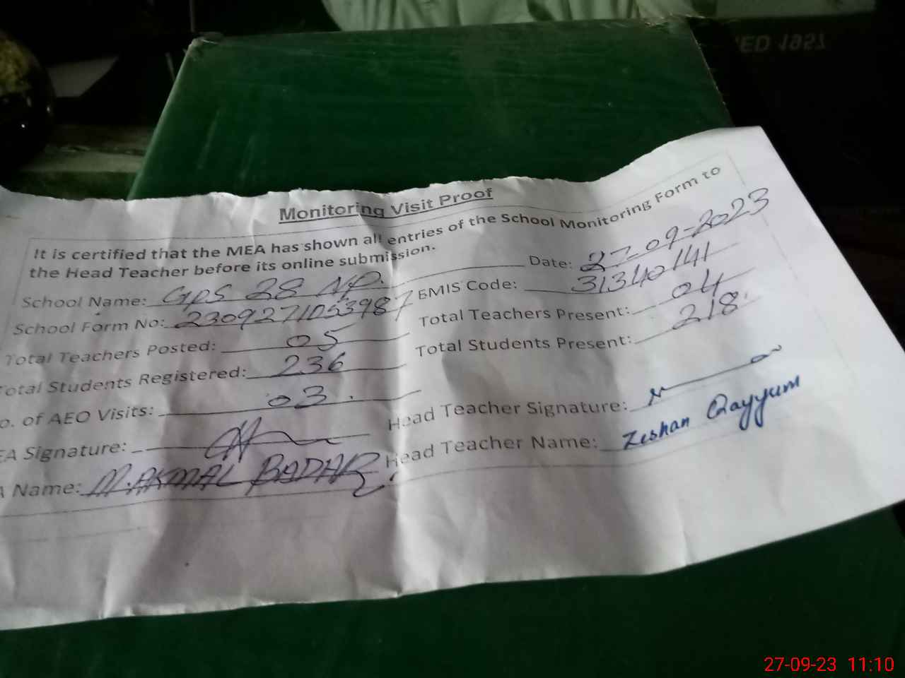 | Attendance Register | Head Teacher | MEA with School | Visit Proof |
