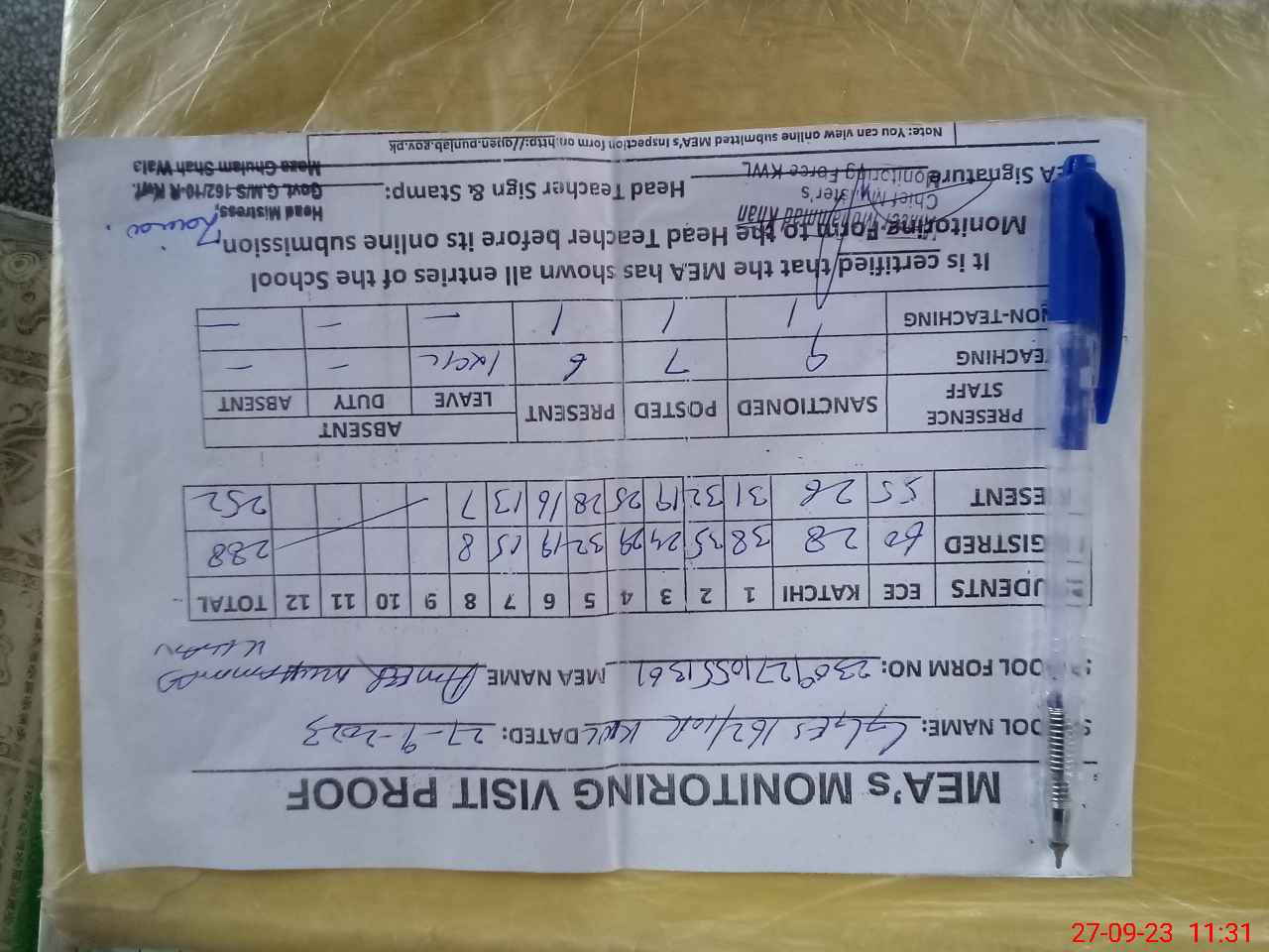 | Attendance Register | Head Teacher | MEA with School | Visit Proof |