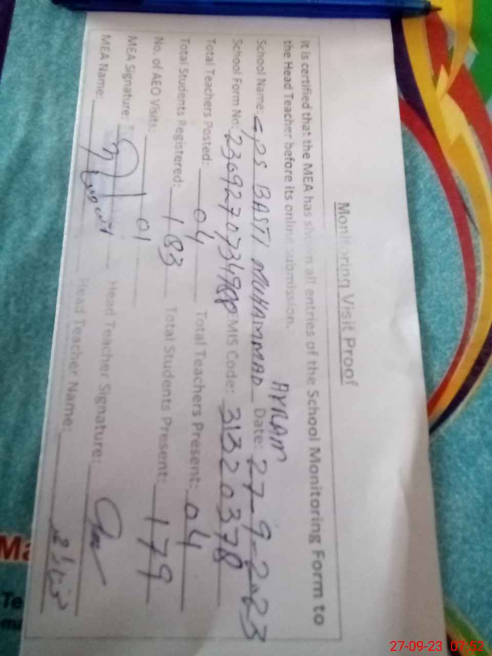 | Attendance Register | Head Teacher | MEA with School | Visit Proof |