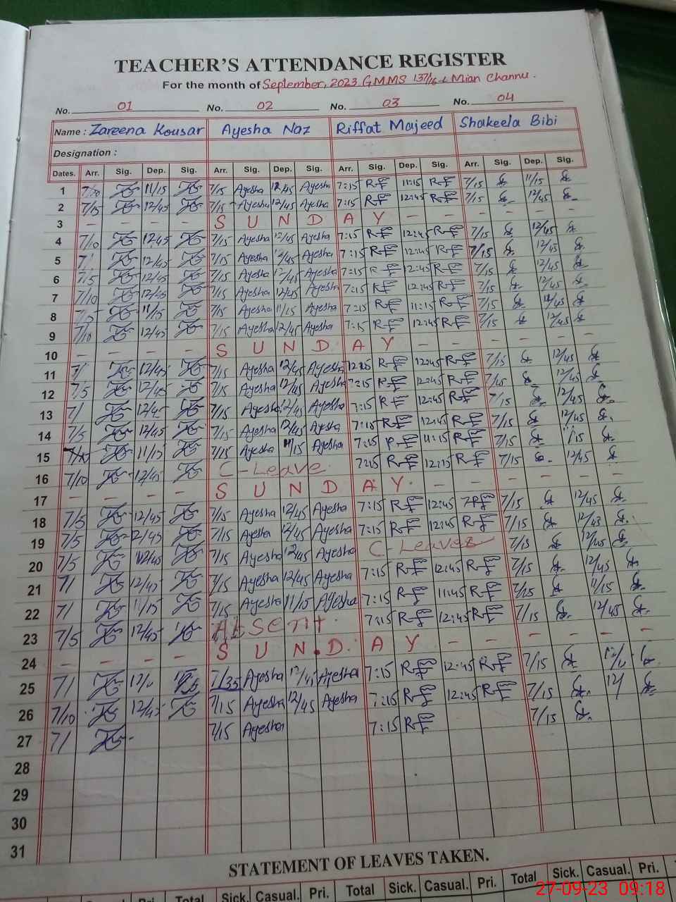 | Leave | Duty | Absent | Maternity | Medical | Ex- Pak |