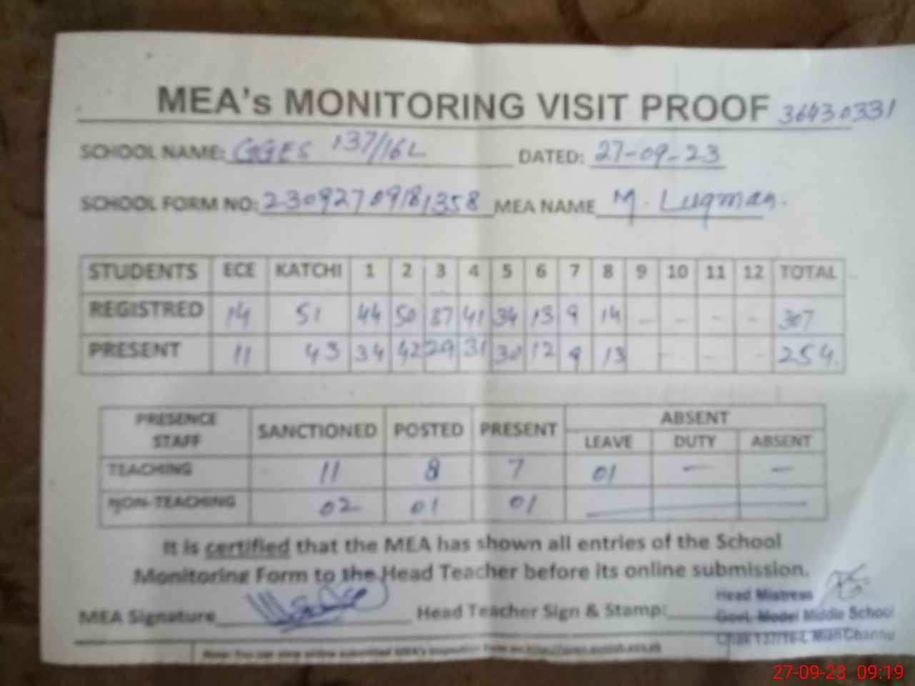 | Attendance Register | Head Teacher | MEA with School | Visit Proof |