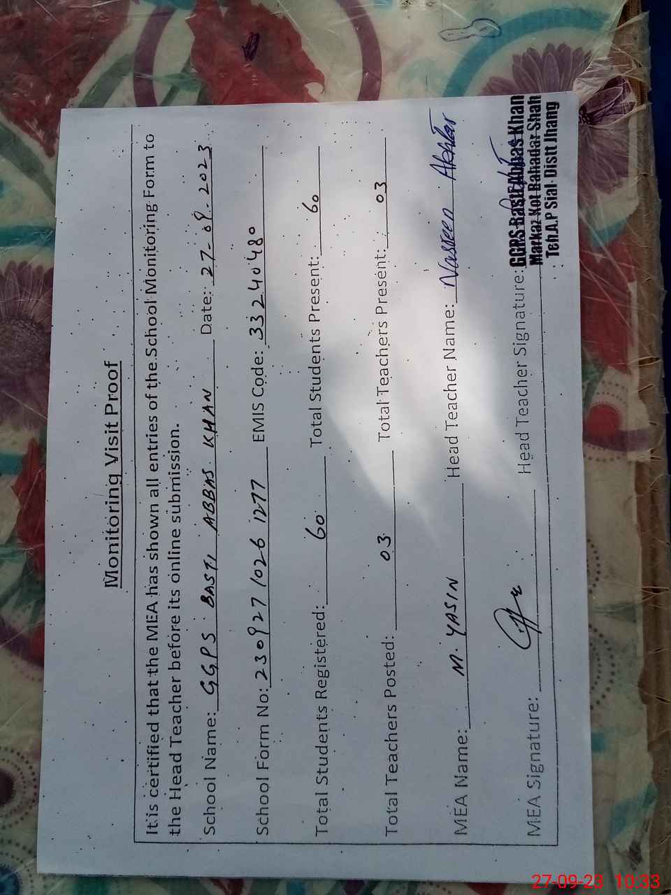| EMIS Code: 33240480 | Name of School: GGPS BASTI ABBAS KHAN | |||
