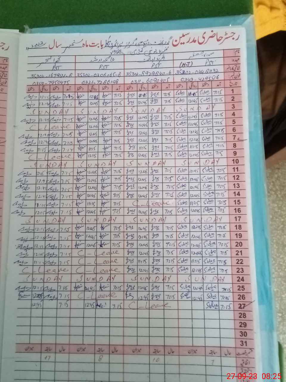 | CNIC | Full Name | Designation | R/C | Absence During Last Calender Month |