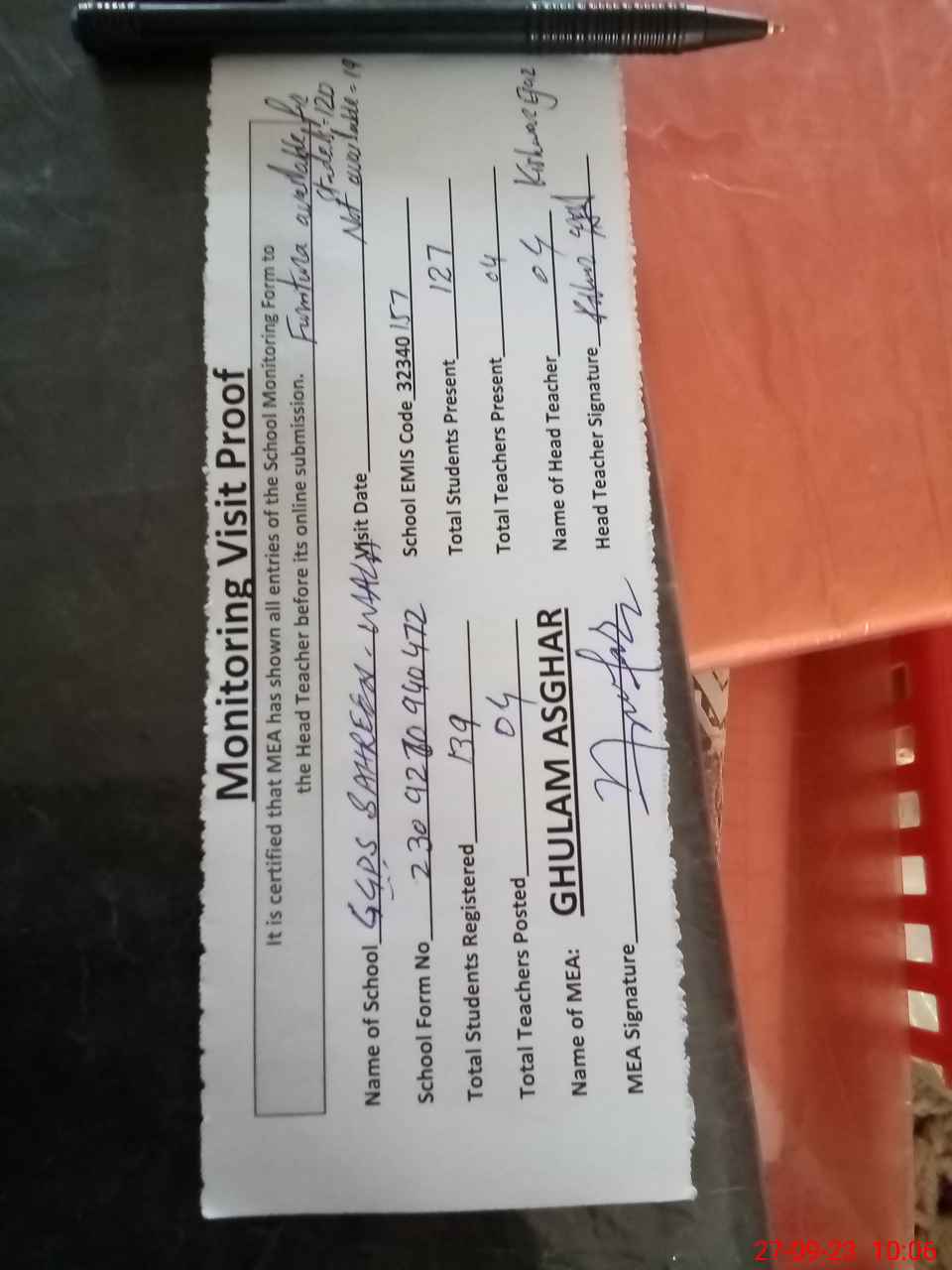 | Attendance Register | Head Teacher | MEA with School | Visit Proof |