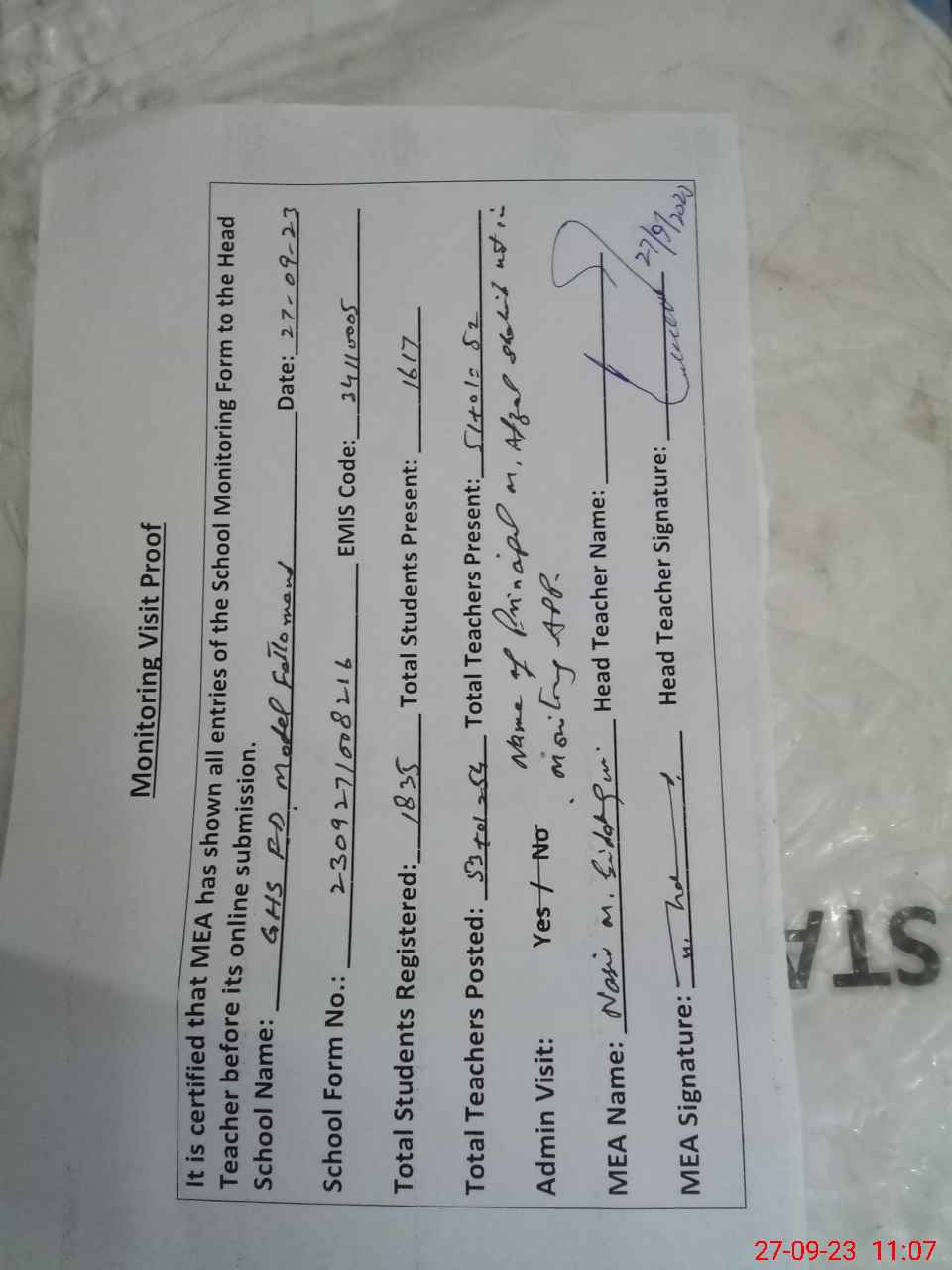 | Attendance Register | Head Teacher | MEA with School | Visit Proof |