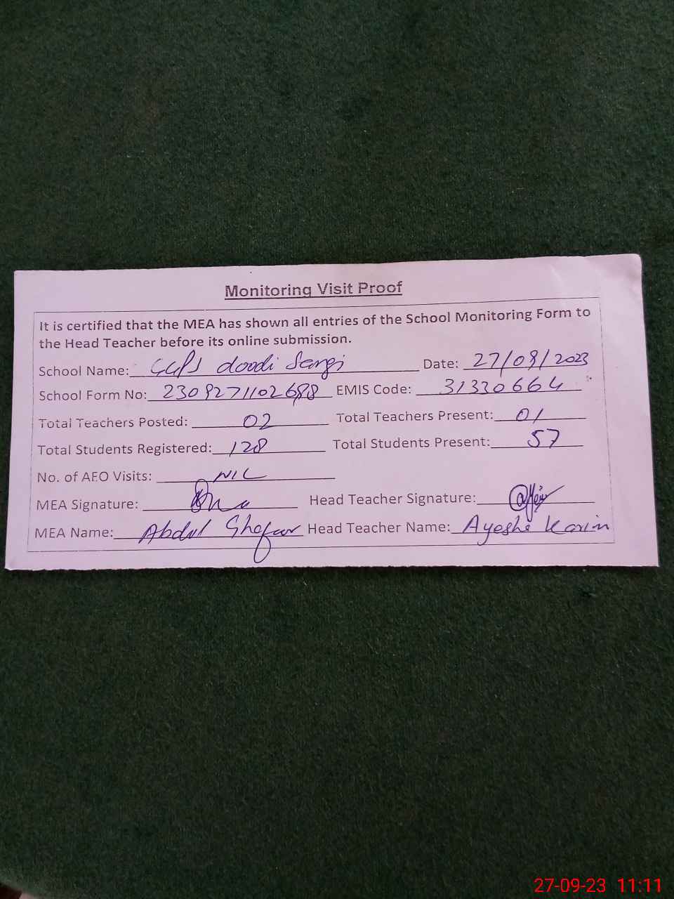 | EMIS Code: 31330664 | Name of School: GGPS DODDI SANGHI BASTI MASTER KHUDA BUX MAHER | |||