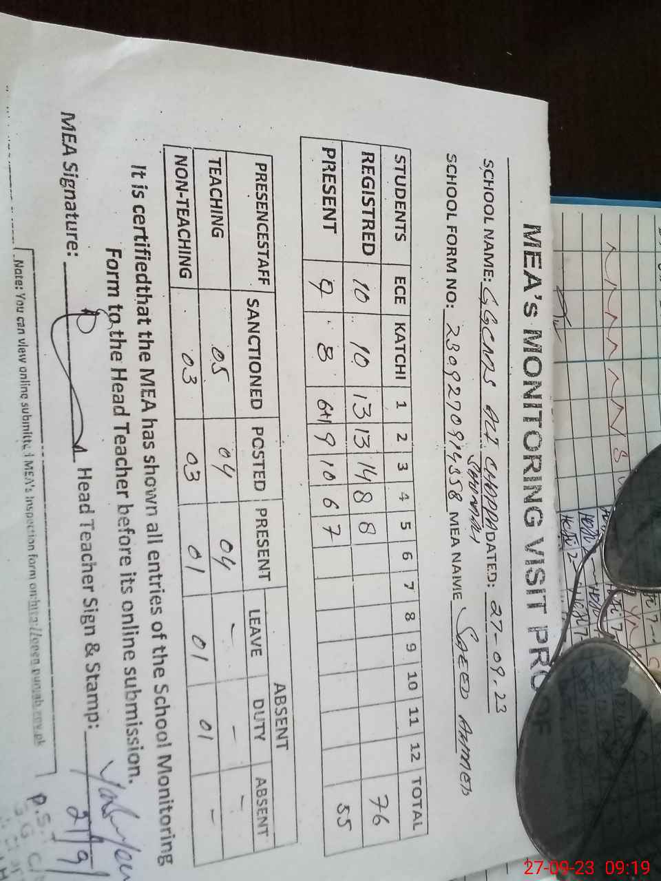 | Monitoring Date: 27-09-2023 | Start Time: 27-09-2023 08:43 AM | End Time: 27-09-2023 09:20 AM | Name of MEA: Sa**** Ah**** | |