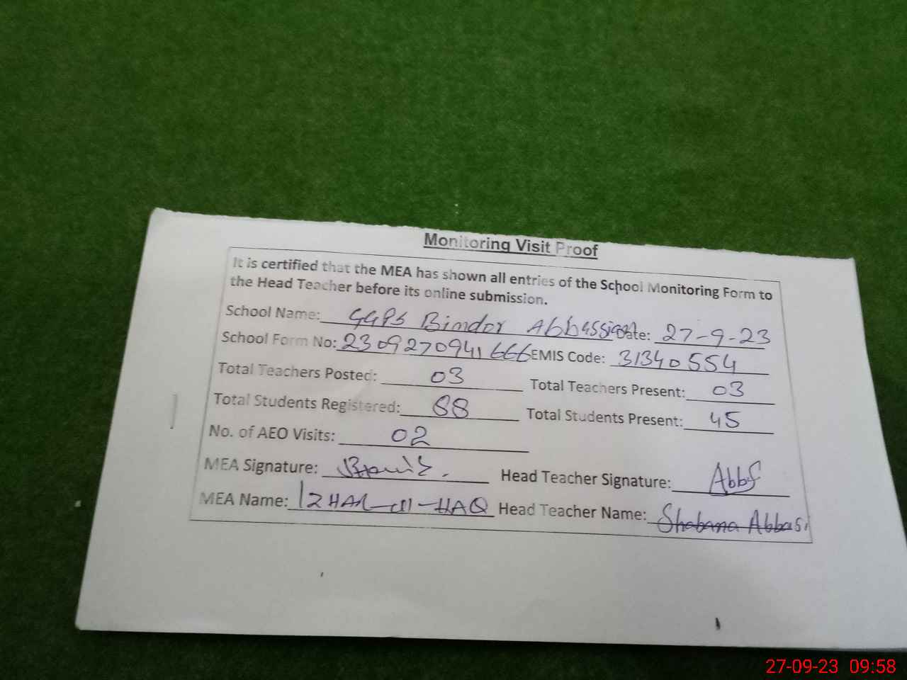 | Monitoring Date: 27-09-2023 | Start Time: 27-09-2023 09:19 AM | End Time: 27-09-2023 10:03 AM | Name of MEA: Mu**** Iz**** UlHa**** | |