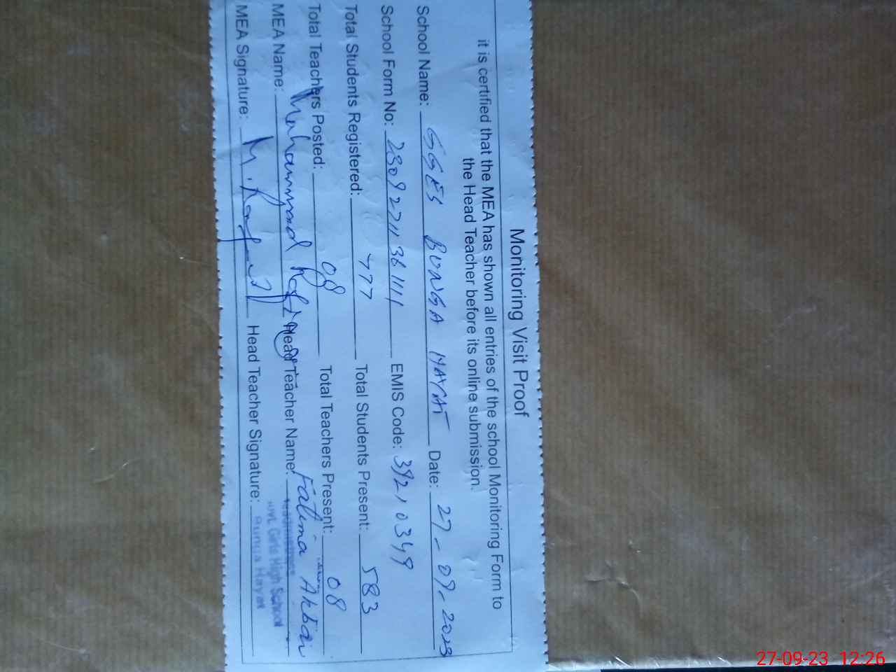 | Attendance Register | Head Teacher | MEA with School | Visit Proof |