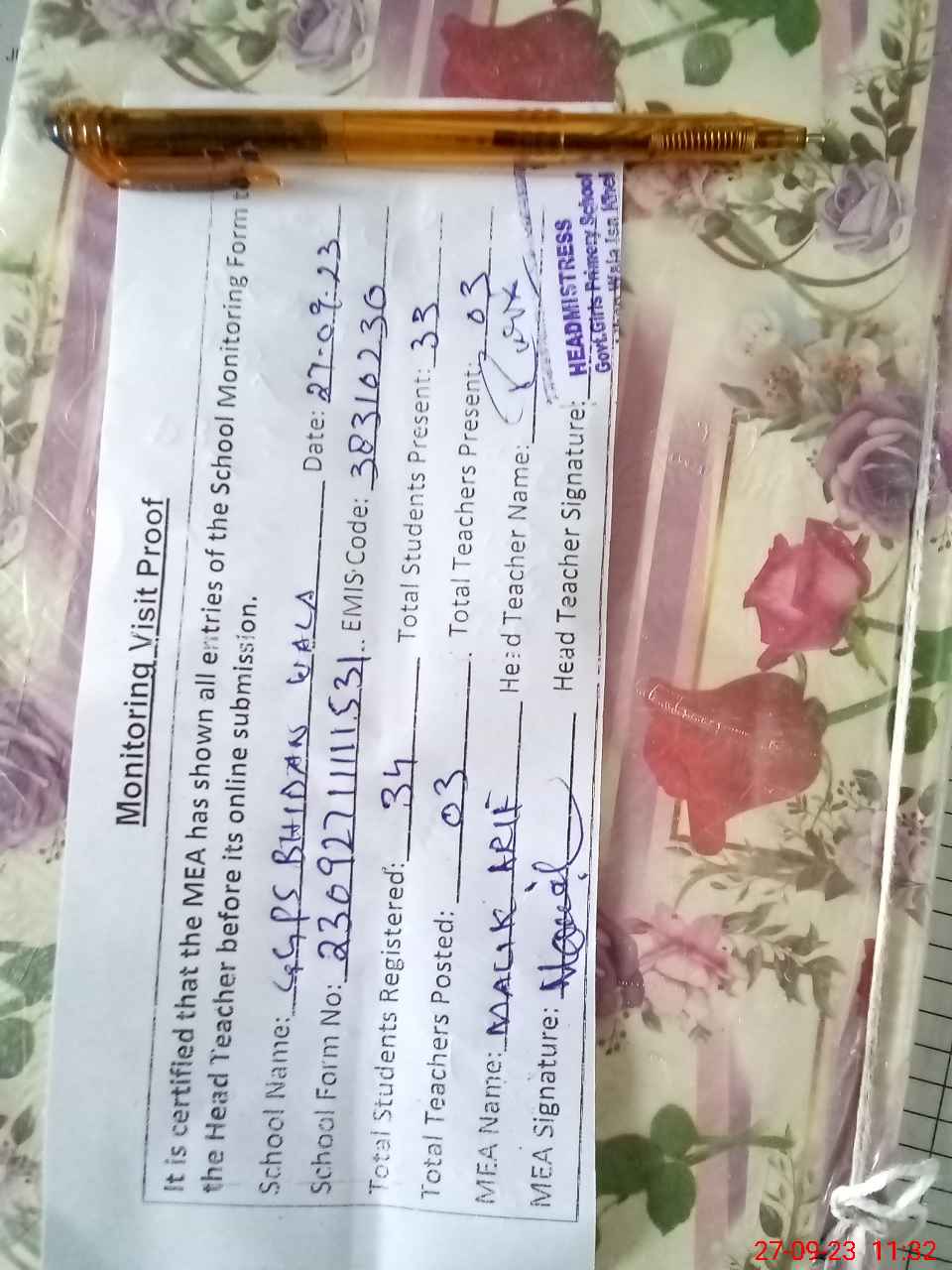 | Attendance Register | Head Teacher | MEA with School | Visit Proof |