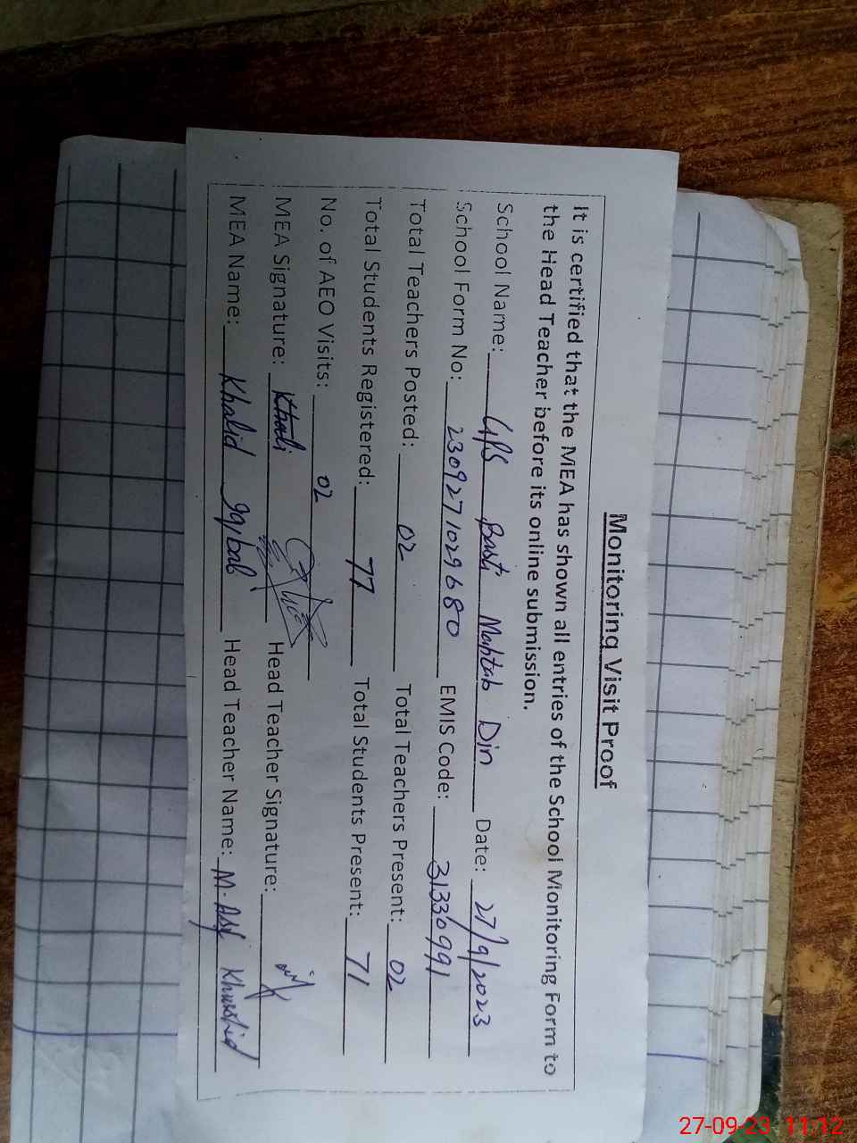| Attendance Register | Head Teacher | MEA with School | Visit Proof |