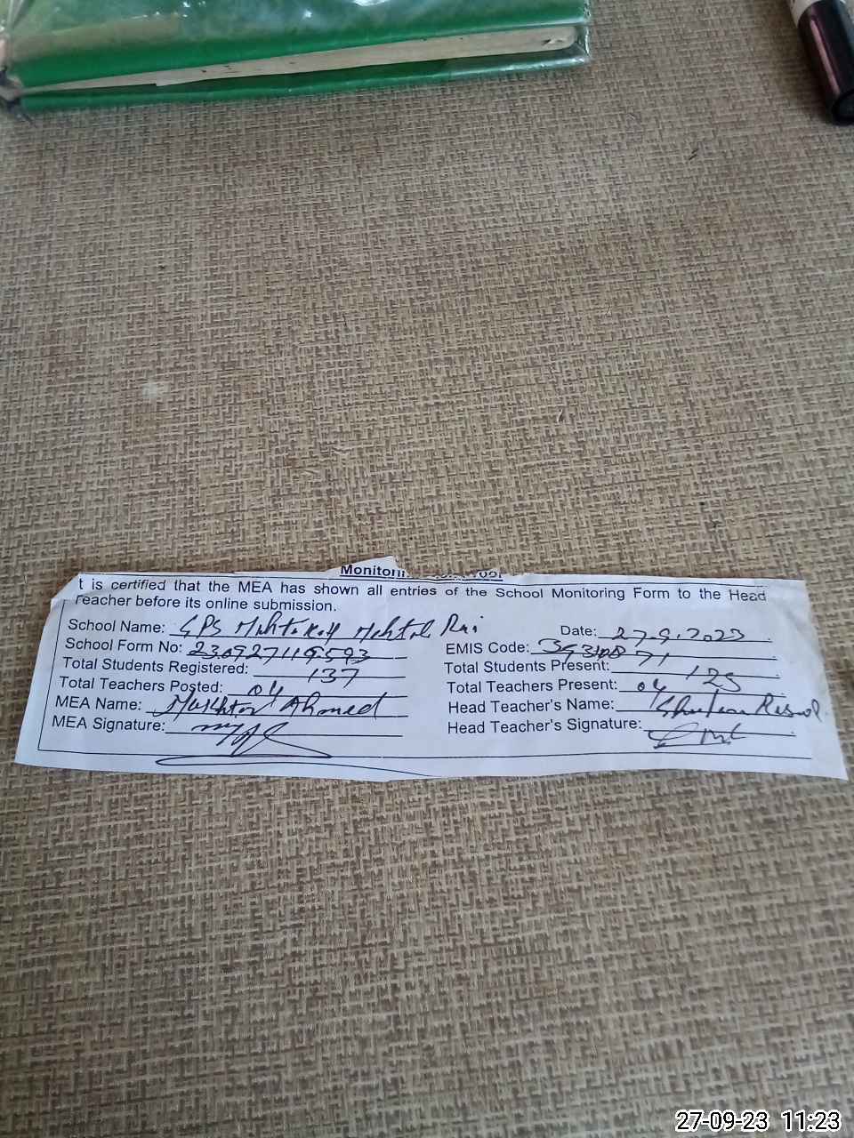| Attendance Register | Head Teacher | MEA with School | Visit Proof |