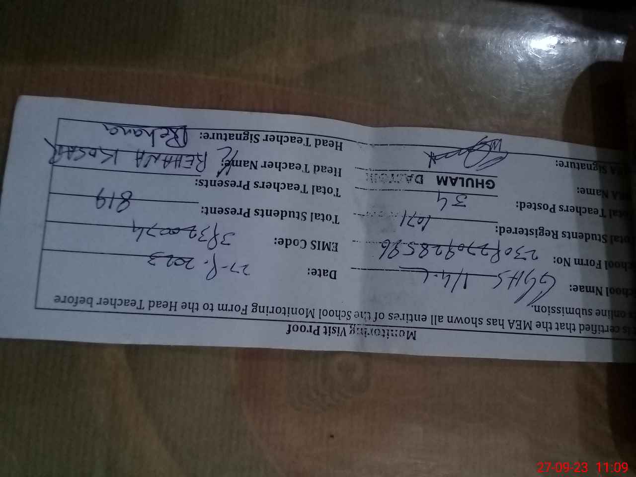 | Monitoring Date: 27-09-2023 | Start Time: 27-09-2023 09:28 AM | End Time: 27-09-2023 11:13 AM | Name of MEA: GH**** DA**** (R**** | |