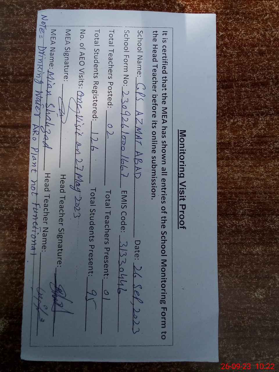 | Monitoring Date: 26-09-2023 | Start Time: 26-09-2023 09:35 AM | End Time: 26-09-2023 10:22 AM | Name of MEA: Sh**** Ah**** | |