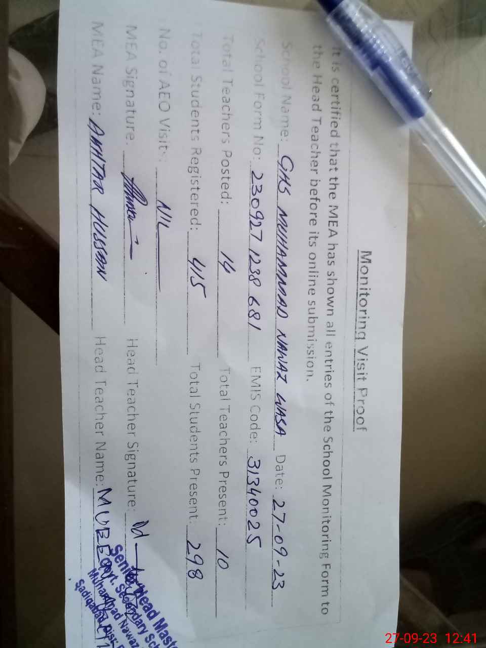 | Attendance Register | Head Teacher | MEA with School | Visit Proof |