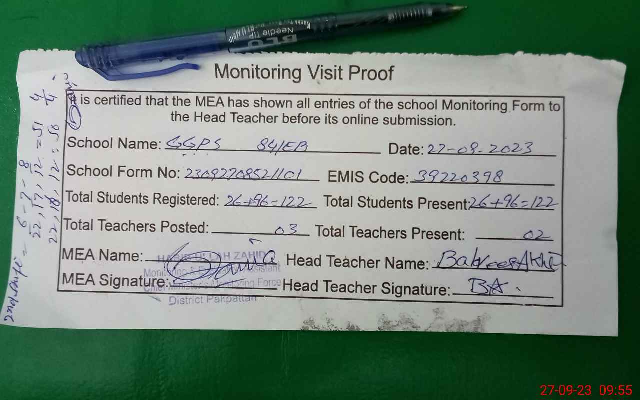 | EMIS Code: 39220398 | Name of School: GGPS 84/EB ARIFWALA | |||